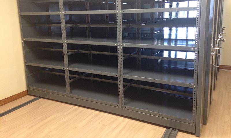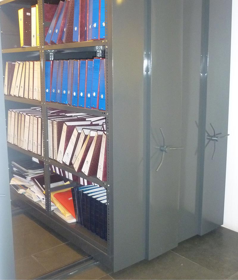 Estantes móviles que se desplazan sobre rieles para sacar el máximo partido del espacio. Especial para bibliotecas o archivos donde se almacena documentación o productos pequeños.